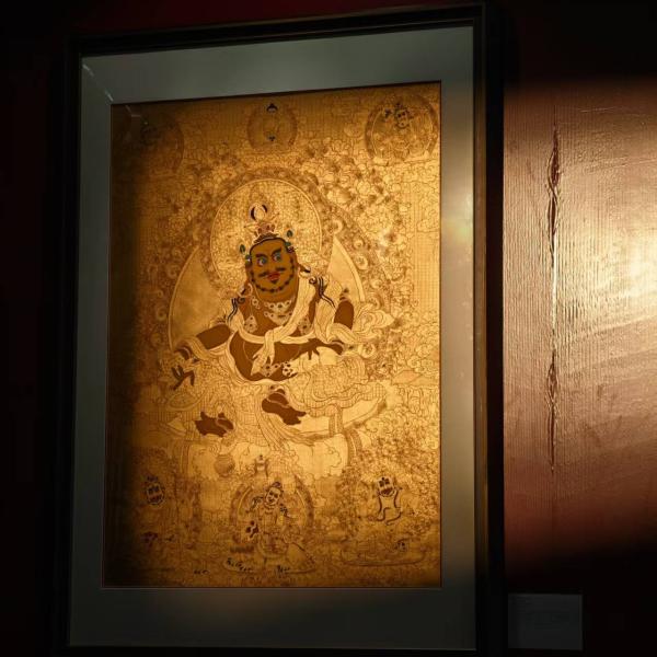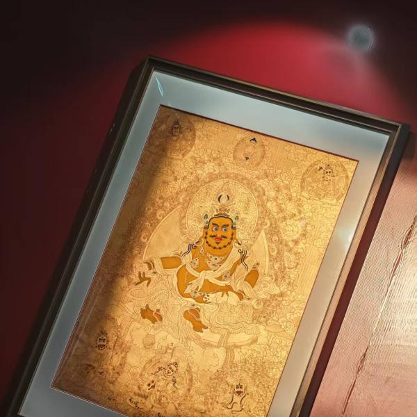 Yellow Jambhala is the most prominent of the Five Family Wealth Deities in Tibetan Buddhism and an important attendant of the Treasure King. He has a golden-yellow body, one face and two arms, with a fierce expression and hair standing on end, wearing a crown of the Five Buddhas, adorned with jewelry all over, appearing both wealthy and majestic. In his right hand, he holds a wish-fulfilling jewel, symbolizing the ability to satisfy all virtuous wishes of sentient beings; in his left hand, he holds a treasure-spitting mouse, from whose mouth endless treasures flow, representing the ability to bestow wealth. He sits in the posture of 如意 (wish-fulfilling) with knees bent on a lotus moon throne, with his right foot stepping on a conch, symbolizing the ability to go into the ocean to obtain treasures. Although Yellow Jambhala is a protector of the worldly realm, in Tibetan Buddhism he is regarded as an emanation of Ratnasambhava Buddha. Practicing his teachings requires a foundation of bodhicitta, a deep belief that wealth originates from the karmic results of generosity. Only through diligent offerings and cultivating widespread good connections can one truly obtain growth in wealth and merit.
