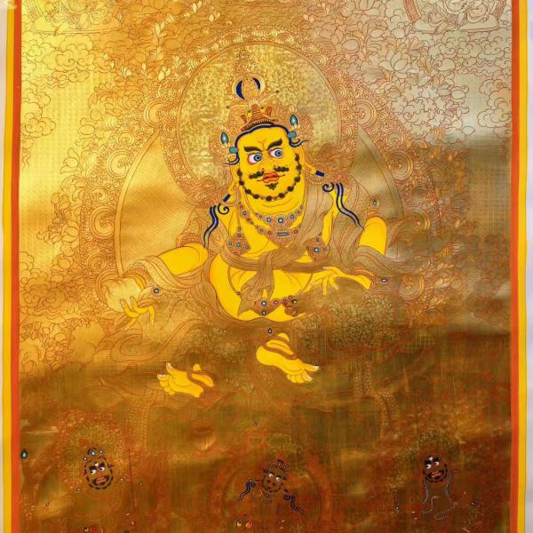 Yellow Jambhala is the most prominent of the Five Family Wealth Deities in Tibetan Buddhism and an important attendant of the Treasure King. He has a golden-yellow body, one face and two arms, with a fierce expression and hair standing on end, wearing a crown of the Five Buddhas, adorned with jewelry all over, appearing both wealthy and majestic. In his right hand, he holds a wish-fulfilling jewel, symbolizing the ability to satisfy all virtuous wishes of sentient beings; in his left hand, he holds a treasure-spitting mouse, from whose mouth endless treasures flow, representing the ability to bestow wealth. He sits in the posture of 如意 (wish-fulfilling) with knees bent on a lotus moon throne, with his right foot stepping on a conch, symbolizing the ability to go into the ocean to obtain treasures. Although Yellow Jambhala is a protector of the worldly realm, in Tibetan Buddhism he is regarded as an emanation of Ratnasambhava Buddha. Practicing his teachings requires a foundation of bodhicitta, a deep belief that wealth originates from the karmic results of generosity. Only through diligent offerings and cultivating widespread good connections can one truly obtain growth in wealth and merit.