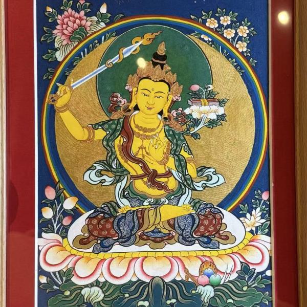 文殊菩萨,全称文殊师利,意为“妙德”或“妙吉祥”,是佛教中般若智慧的人格化代表,常被尊为“诸佛之师”与“七佛之母”。在汉传佛教中,他与普贤菩萨同为释迦牟尼佛的左右胁侍,合称“华严三圣”;在藏传佛教中,他与观世音菩萨、金刚手菩萨并称“三怙主”,分别代表智慧、慈悲与力量。文殊菩萨的形象通常为顶结五髻(象征大日如来的五智),右手持能斩断一切无明烦恼的智慧宝剑,左手当胸持莲花,花上托着代表宇宙真理的般若经典,身骑威猛的青狮,以智慧利剑摧伏群魔。其核心思想在于“般若非知识,乃超越二元之直观”,著名的“文殊仗剑逼佛”公案便以极端手段开示“诸法空性”之理。
